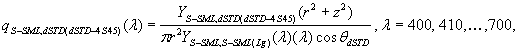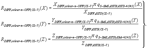 Если испытания проведены при диффузной освещенности под углом 30° вместо 45°, то в уравнениях (37) и (38) используют величину qS-SML,dSTD (dSTD-n30) вместо ВМеСТО qS-SML,dSTD (dSTD-n45). Рефлектометрические величины для диффузного отражения вычисляют по формулам (см. таблицу 42):