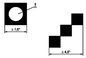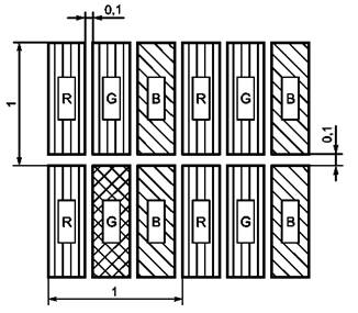 1 - проектное расстояние наблюдения Рисунок 10 - Панель малых размеров Примечания 1 Панели малых размеров, не вмещающие более 40 типовых латинских знаков, не входят в область применения настоящего стандарта. Настоящее определение применяют только при выводе изображения на экран и выборе мест измерений, см. 8.4.2 Стандартные места измерений. 2 При проектном расстоянии наблюдения 500 мм угловой размер 1,6° соответствует 14 мм, а угловой размер 4,8° - 42 мм. 3.4.12 субпиксель (subpixel): Внутренняя структура в пикселе с отдельной адресацией, расширяющая функции пикселя. Примечание - Существуют изделия, включающие субпиксели основного цвета, используемые в некоторых многоцветных плоских панелях, и изделия с субпикселями, и имеющими кратные размеры, используемые для создания полутонов шкалы яркости. Микроструктура пикселей иногда используется для уменьшения анизотропии или улучшения видимости введением избыточности в плоских панелях. Такие микроструктуры в настоящем стандарте называются субпикселями. В технической литературе по данной тематике часто применяют термин «точка», который в настоящем стандарте не применяют. 3.4.13 дефекты пикселя (pixel faults): Локальные дефекты типов 1,2 или 3, см. таблицы 2 и 3. Таблица 2 - Дефекты пикселя