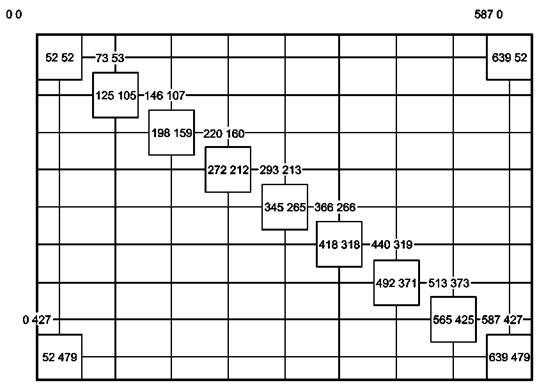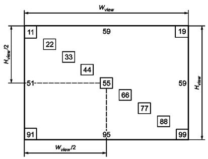 Рисунок 32 - Возможные места измерений На рисунке 33 приведен пример возможных мест измерений, применимый к панели 640 × 480 пикселей, и не более чем с 44 пикселями на градус. Каждое пиксельное пятно состоит из квадратов со стороной 53 пикселя. Пара чисел вне квадрата (см. рисунок 33) - адрес верхнего левого пикселя, пара чисел внутри квадрата - адрес правого нижнего пикселя. Нумерация адресов пикселей принята, чтобы адрес 00 относился к пикселю в крайнем левом верхнем углу и до 639479 для пикселя в крайнем правом нижнем углу. Так как на панели четное число пикселей, то центрального пикселя нет. Поэтому центр участка 55 имеет номера 319 и 239. 8.4.2.3 Малые дисплеи на плоских панелях На малых дисплеях на плоских панелях участки измерений выбирают так же, как и на больших, за исключением участков 19 и 91. Наложение тестируемых участков плоской панели более чем на 25 % не является необходимым, так как иногда полная установка девяти участков не требуется. Всегда измеряют место наименьшей яркости (или коэффициента яркости) LL, наибольшую яркость HL, и участок 55 - CL. 8.4.2.4 Дополнительные места Если на плоской панели имеются места вне оцениваемых 11 участков, которые при обычных условиях внешней освещенности визуально хуже, чем участок LL или участок HL, то помимо измерений на участках LL и HL проводят дополнительные измерения. Заключение «визуально хуже» принимает подготовленный персонал в условиях темной комнаты.
