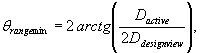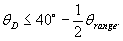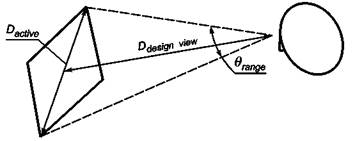Рисунок 11 - Зависимость «расстояние наблюдения - высота знака» 7.2 Проектное направление наблюденияДисплей должен соответствовать всем оптическим требованиям в пределах диапазона направлений наблюдения. Поставщик должен определить проектное направление наблюдения θD, φD и диапазон угла наклона θrange. Диапазон угла наклона θrange должен превышать значение, обеспечивающее проектное расстояние наблюдения Ddesjgn view и высоту знака ψ = 22'. Проектный угол наклона θD должен быть более 0° (случай симметричного конуса наблюдения) и менее 40° - θrange /2 (чтобы избежать измерений с углами вне 80° конуса наблюдения), см. рисунок 12.