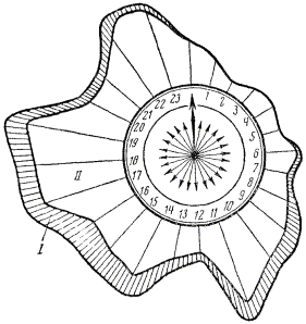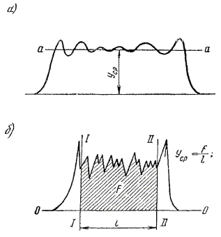 Обработка результатов измерений заключается в вычислении величины коэффициента сцепления по полученным в процессе измерений величинам тягового усилия. В случае записи на бумажную меловую ленту или пленку осциллографа обработка состоит из определения средней величины ординаты криволинейной записи. Если кривая записи имеет плавный характер (рис. 67), то среднюю линию а - а можно с достаточной степенью точности провести на глаз и непосредственным замером получить величину ординаты. Если же кривая записи имеет вид изрезанной линии, то для обработки целесообразно применить планиметр. Начальный и конечный участок записи с максимальными ординатами, соответствующими небольшим значениям коэффициента сцепления (перемещение колес тележки с частичным проскальзыванием на грани полной блокировки), из последующей обработки следует исключать. Площадь, ограниченную кривой записи и нулевой линией, измеряют планиметром. Среднюю величину ординаты получают делением площади на длину участка, ограниченного линиями I - I и II - II. По полученным ординатам и данным тарировки динамометрической тележки получают тормозное усилие, на основании которого и вычисляют величину коэффициента сцепления.