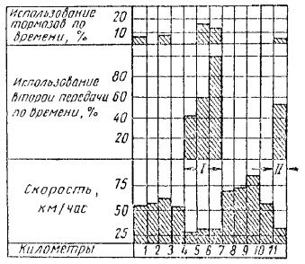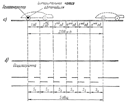 Измерения состоят из торможения (блокировки) колес динамометрической тележки во время движения автомобиля с определенной скоростью движения в продолжение 1,0 - 2,0 сек. Одновременно включается регистрирующий прибор, записывающий величину тягового усилия.