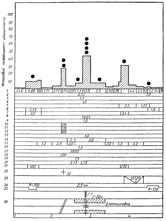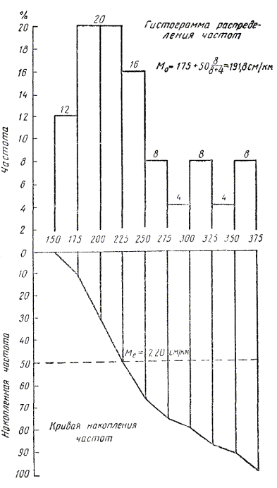 Анализ графиков и выражений статистической обработки позволяет оценить не только ровность всего маршрута в целом, но и выяснить характерные особенности состояния дорожного покрытия. Так, например, кривая накопления частот позволяет определить общее протяжение отдельных участков дороги с ровностью, которая характеризуется конкретной величиной показания прибора. На графике рис. 63 видно, что большинство участков имеют ровность в пределах от 150 до 250 см/км, кривая накопления частот указывает на то, что в таких пределах показания толчкомера имеют 68 % из всех измеренных километров, а удовлетворительную оценку имеют 80 % всех участков.