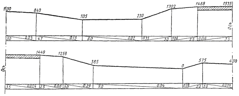 Среднее значение коэффициента сцепления для каждого участка определяют путем обработки результатов измерения методом математической статистики. По средним значениям коэффициента сцепления строят график коэффициента сцепления по длине дороги (рис. 68). На этом графике откладывают полученные средние величины для правой и левой полос движения, а также при наличии измерений, для полос наката и оси проезжей части. Кроме того, желательно для каждого характерного участка построить график изменения коэффициентов сцепления в поперечном профиле проезжей части.