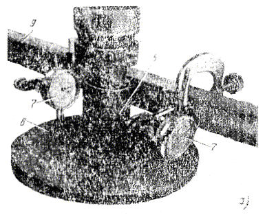 1 - рама прибора; 2 - выключатель электродвигателя; 3 - электродвигатель; 4 - эксцентрический вал; 5 - меловая бумага; 6 - запись микропрофиля; 7 - измерительная игла-щуп; 8 - основание прибора; 9 - измеряемая поверхность