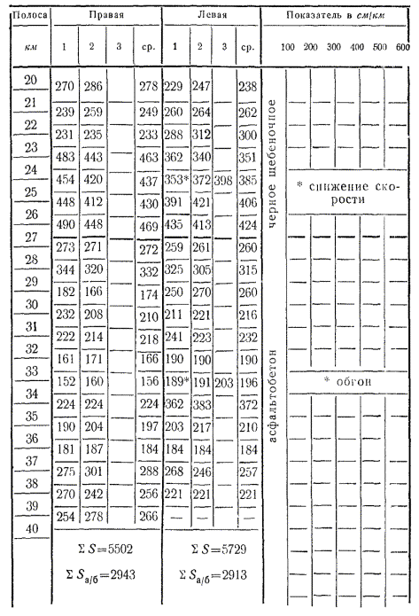 Практика обследований дорожных покрытий прибором этого типа позволила разработать методику оценки шероховатости. Ориентировочно участки для оценки шероховатости намечают в подготовительный период после ознакомления с материалами, характеризующими тип и конструкцию дорожных покрытий, срок их службы и интенсивность движения. В процессе рекогносцировочного проезда по дороге намеченные участки уточняют путем визуального осмотра их состояния. Во время рекогносцировочного осмотра количество намеченных ранее участков значительно увеличивается за счет уточнения состояния покрытий одного и того же типа. На выбранных для обследований участках намечают поперечники, отражающие шероховатость всего рассматриваемого участка. В среднем, в зависимости от состояния покрытия, намечают один поперечник на километр. На каждом поперечнике оценку шероховатости выполняют по всей ширине проезжей части, назначая первый участок измерений на расстоянии 0,5 м от кромки проезжей части, а последующие через каждый метр друг от друга. На каждом из участков измерения проводят перпендикулярно и параллельно оси дороги, а затем, если результаты не сходятся, дополнительно под углом 45° к одному из ранее замеренных направлений. Таким образом, на каждом участке получают 3 - 4 значения, характеризующие шероховатость покрытия. В соответствии с этой методикой на каждом поперечнике проезжей части шириной 7 м измерения проводят на 7 участках и на каждом из них получают 3 - 4 характеристики шероховатости. В общей сложности на каждом поперечнике получают от 24 до 28 величин. Результаты измерений заносят в ведомость по следующей форме: