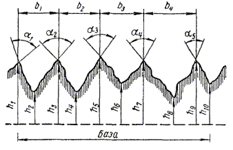 h - высота неровностей, b - шаг неровностей (расстояние между выступами), α - угол при вершине