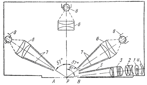 1 - источник света; 2 - трехлинзовый конденсатор; 3 - объектив; 4 - отражатель; 5 - зеркало; 6 - двухлинзовый конденсатор; 7 - черные матовые пластины; 8 - фотоэлемент; АВ - прорезь в корпусе прибора