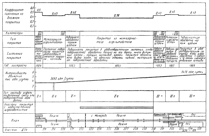 В процессе анализа графиков выясняют причины появления участков покрытия с низкими значениями коэффициентов сцепления и разрабатывают рекомендации по приведению их в соответствие с требованиями движения.