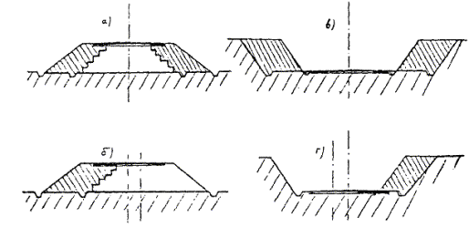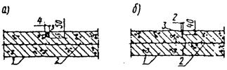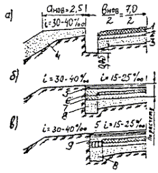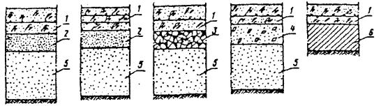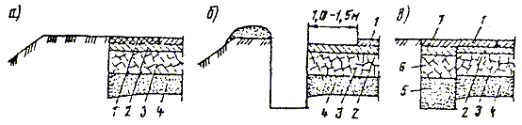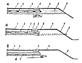 Рис. 25. Уплотнение материалов на полосе уширения Рис 26. Схема уширения и усиления переходного покрытия: а - подготовка ровика для уширения; б - уширение и усиление при основании из щебня; в - то же при основании уширения из камня; 1 - кирковка существующего покрытия на глубину 5 - 7 см; 2 - старое покрытие (щебеночное, гравийное); 3 - песчаный слой, 4 - присыпка обочины и земляного полотна; 5 - асфальтобетон; 6 - уширение и утолщение новым щебнем; 7 - то же старым щебнем; 8 - поперечный слой уширения; 9 - уширение и утолщение щебнем