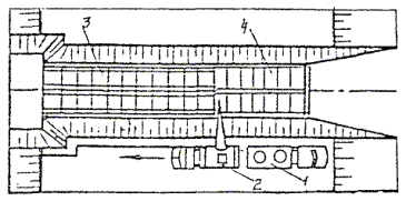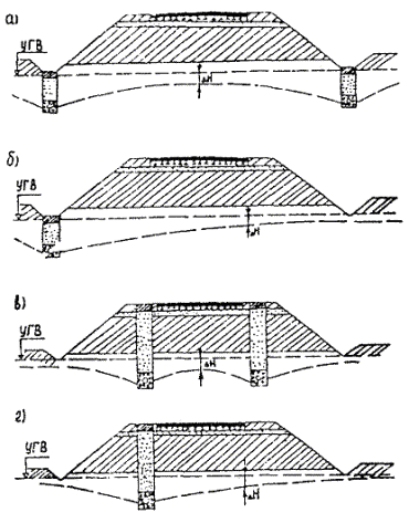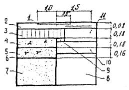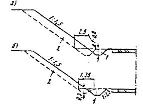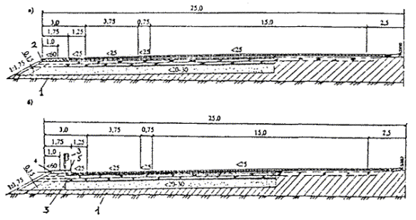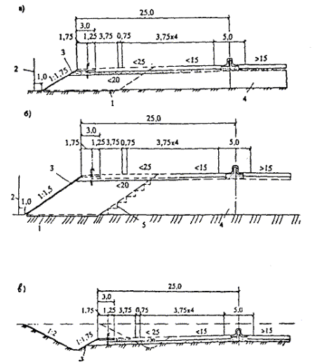 При уширении существующей проезжей части на дорогах I категории большей частью это уширение осуществляют на одну, две, а иногда и более полосы движения шириной по 3,75 м. Технология строительства таких полос близка технологии нового строительства и вызывает меньше организационных затруднений, чем строительство узкой полосы. Однако здесь, как и во всех случаях уширения, большое значение имеет прочность сопряжения существующей дорожной одежды с новой конструкцией. Качество такого сопряжения обеспечивается в определенной степени применением близкой конструкции полосы уширения и существующей дорожной одежды, а также сплошным слоем усиления по всей полосе проезжей части. При этом не следует допускать, чтобы продольный стык полос укладки асфальтобетона при устройстве слоя усиления проходил над сопряжением старой одежды и полосы уширения. В случае уширения существующего цементобетонного покрытия или основания хорошее качество сопряжения с цементобетонной полосой уширения дает конструкция, приведенная на рис. 27. Однако эта конструкция достаточно сложна технологически. Большой опыт реконструкции автомагистрали I категории дают работы, осуществляемые на Московской кольцевой автомобильной дороге (МКАД). Полоса уширения включает два слоя укатываемого бетона с прослойкой битумной эмульсии, технологический слой щебня и песчаный морозозащитный слой. Затем по всей ширине проезжей части строят двухслойное асфальтобетонное покрытие, причем верхний слой - из смеси на модифицированном битуме. Было рассмотрено несколько вариантов конструкции усиления дорожной одежды (рис. 28). Рис. 27. Уширение цементобетонного покрытия с обеспечением связи полосы уширения с существующим покрытием: 1 - цементобетонная полоса уширения; 2 - существующее цементобетонное покрытие; 3 - арматурный стержень Рис. 28. Конструкции дорожной одежды, принятые при реконструкции МКАД: а - на участках дороги с продольным уклоном от 0 до 3 ‰; б - на участках дороги с продольным уклоном более 3 ‰; 1 - непучинистый или слабопучинистый грунт земляного полотна; 2 - укрепление обочин подобранным щебеночным материалом слоем толщиной 0,23 м; 3 - ограждение; 4 - укрепление обочин растительным грунтом слоем толщиной 0,23 м; 5 - бордюр Расчетная приведенная интенсивность движения на одну наиболее нагруженную полосу, исходя из общей интенсивности и состава движения, на расчетный 2015 год составит 6045 автомобилей в сутки с нагрузкой на ось 100 кН (10 тс). Указанной приведенной интенсивности движения соответствует требуемый модуль упругости Еф = 320 МПа. В результате технико-экономического сравнения вариантов конструкций дорожных одежд для уширения МКАД принята следующая дорожная одежда: · верхний слой покрытия из плотного асфальтобетона из горячей мелкозернистой щебеночной смеси типа А, I марки (ГОСТ 9128-84) на дробленом (или природном с добавлением дробленого песка) гранитном щебне М-1200, с 1997 г. на габбродиабазном щебне и модифицированном битуме на основе ДСТ (ТУ 35-1669-88), толщиной 8 см; · нижний слой покрытия из пористого асфальтобетона из горячей крупнозернистой щебеночной смеси, I марки (ГОСТ 9128-84), на гранитном щебне М-1200, толщиной 0,08 см (с 1996 г, из плотного асфальтобетона типа Б, I марки (ГОСТ 9128-84); · основание из высокопористого асфальтобетона из горячей крупнозернистой смеси, I марки, на гранитн