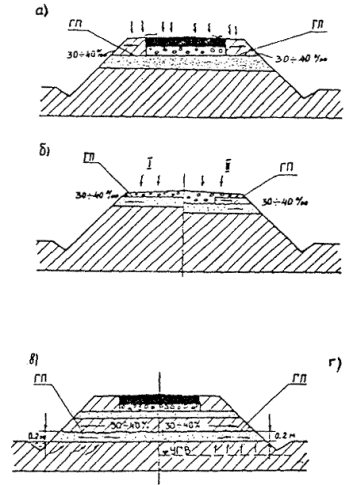 где hэкв - толщина однородной плиты, см; Ест.п. - модуль упругости материала старого покрытия, эквивалентный по жесткости на изгиб старому покрытию и слою усиления; hст.п. - толщина старого покрытия; Еус - модуль упругости материала, используемого для усиления, МПа; hус - толщина усиления. Для усиления дорожных одежд с цементобетонным покрытием рекомендуется применять полимер асфальтобетон в соответствии с техническими условиями ТУ 35-1669-88 «Вяжущие полимерно-битумные на основе ДСТ и полимер асфальтобетон», утвержденными Минтрансстроем СССР в 1988 г. [28]. Полимерасфальтобетон обладает повышенной прочностью, эластичностью и теплостойкостью в широком диапазоне эксплуатационных температур. Применение полимерасфальтобетона повышает трещиностойкость слоя усиления над поперечными швами старого цементобетонного покрытия. Для приготовления полимерасфальтобетонных смесей следует использовать полимерно-битумные вяжущие (ПБВ) на основе дивинилстирольного термоэластопласта (ДСТ) соответствующих марок. В зависимости от вязкости ПБВ делятся на следующие марки ПБВ 40/60, ПБВ 60/90, ПБВ 90/130, ПБВ 130/200, ПБВ 200/300. ПБВ получают введением в битум 2 - 4 % ДСТ от массы. В вязкие битумы ДСТ следует вводить в виде раствора в битумном сырье (гудроне) или жидком битуме. В качестве пластификаторов при приготовлении ПБВ используются индустриальные масла. Введение 2, 3 и 4 % ДСТ дает возможность получить ПБВ с температурой перехода в хрупкое состояние -25, -35 и -50 °С соответственно. Для получения ПБВ с температурой перехода в хрупкое состояние -60 °С в битум необходимо вводить до 6 % ДСТ. Применение ПБВ с температурой перехода вяжущего в хрупкое состояние, соответствующей минимальной зимней температуре эксплуатации слоя усиления, обеспечивает трещиностойкость этого слоя, в особенности над поперечными швами усиливаемого покрытия. Зерновой состав полимерасфальтобетонных смесей должен удовлетворять требованиям ГОСТ 9128-84 «Смеси асфальтобетонные дорожные, аэродромные и асфальтобетон». Полимерасфальтобетонные смеси должны удовлетворять требованиям ГОСТ 9128-84 для асфальтобетонных смесей соответствующих марок. Контрольные испытания качества полимерасфальтобетона в покрытии следует производить по водонасыщению, набуханию, пористости минерального остова и остаточной пористости, а также по коэффициенту уплотнения. Качество ПБВ устанавливают стандартными методами, принятыми для оценки свойств дорожных битумов. Кроме того, определяют однородность и показатель эластичности, характеризующий способность ПБВ к обратимым деформациям, в соответствии с ТУ 35-1669-88. Слои усиления из непрерывно армированного бетона устраивают в соответствии с ВСН 4-75 «Временными техническими указаниями по проектированию и строительству непрерывно армированных цементобетонных дорожных покрытий и оснований в г. Москве», утвержденными Главмосинжстроем в 1974 г. Слои усиления из непрерывно армированного бетона устраивают неограниченной длины и прерывают их только перед искусственными сооружениями (мостами, путепроводами и т.д.). Концевые участки слоев усиления из непрерывно армированного бетона должны быть закреплены неподвижными упорами траншейного или свайного типа. Слои усиления должны обеспечивать прочность и ровность дорожной одежды в течение заданного срока службы под воздей