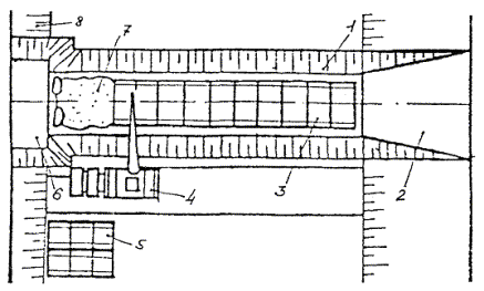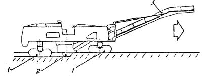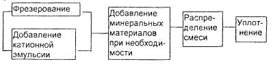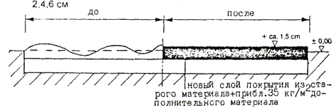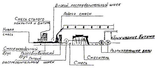 На слой покрытия из этого материала необходимо уложить защитный слой, или тонкий слой износа. В НПО РосдорНИИ разработан метод повторного использования гранулята путем изготовления асфальтогранулобетонной смеси (АГБ-смеси), укладки и уплотнения, в результате формируется асфальтогранулобетон (АГБ). АГБ-смесь приготавливают в смесительной установке с принудительным перемешиванием в холодном состоянии асфальтобетонного гранулята с добавками: щебня фракций 5 - 25 мм (если необходимо), цемента, катионной битумной дорожной эмульсии и воды смачивания, если влажность гранулята ниже 1 %. Добавки в гранулят вводят в таком порядке: щебень, вода смачивания, эмульсия, цемент. При приготовлении АГБ-смеси может быть использован гранулят, полученный как при послойном, так и однопроходном фрезеровании существующего покрытия на глубину 14 - 30 см. Однако кривая гранулометрического состава гранулята должна иметь плавное очертание и вписываться в границы составов для пористых и высокопористых смесей, зерен щебня фракций крупнее 5 мм должно быть не менее 35 - 40 %. В противном случае к грануляту добавляют щебень. Ориентировочная доля отдельных компонентов по массе гранулята составляет: битумной эмульсии - 2 - 4 %; портландцемента - 2 - 5 %; вода - 4 - 6 %. Приготовленная смесь укладывается на подготовленном основании при температуре воздуха не ниже 0 °С и уплотняется сначала виброплитой, а затем звеном катков. После испарения влаги (примерно через 2 ч после окончания уплотнения) можно открывать движение автотранспорта с ограничением скорости до 40 км/ч. Через 4 - 5 часов можно укладывать следующий слой асфальтобетона, который выполняет роль защитного слоя и слоя износа. Вся технология может быть реализована в двух вариантах: а) ведущая машина - фрезеровальная машина. В этом случае перемешивание и укладка смеси производятся в передвижном смесителе; б) ведущая машина - фрезеровально-смешивательная машина, которая выполняет все операции по фрезерованию, перемешиванию, укладке и предварительному уплотнению смеси. Методы холодно-горячей регенерации (комбинированные методы) можно разделить на две группы: а) с переработкой старого асфальтобетона на месте (на дороге) в передвижных смесительных установках; б) с переработкой старого асфальтобетона на стационарных асфальтобетонных заводах. Технология холодно-горячей регенерации с переработкой старого асфальтобетона на месте в передвижной смесительной установке была реализована в России при реконструкции дороги Москва - Минск с использованием специального комплекта машин, поставленных итальянской фирмой «Павиметалл». Основной машиной этого комплекта является передвижная асфальтосмесительная установка с сушильным барабаном фирмы «Марини». В состав комплекта входят: щебнераспределитель, холодная фрезеровальная машина, передвижная асфальтосмесительная установка, асфальтоукладчик, комплект катков. Технология работ включает следующие операции: · на очищенное от пыли и грязи покрытие распределяется равномерный слой щебня на всю полосу регенерации. Новый щебень обычно добавляют в количестве 50 - 70 % от объема сфрезерованного гранулята; · холодной фрезой на глубину 30 - 50 мм снимается верхний слой покрытия, измельчается, одновременно перемешивается с новым щебнем и выкладывается в виде вала на полосе фрезеро