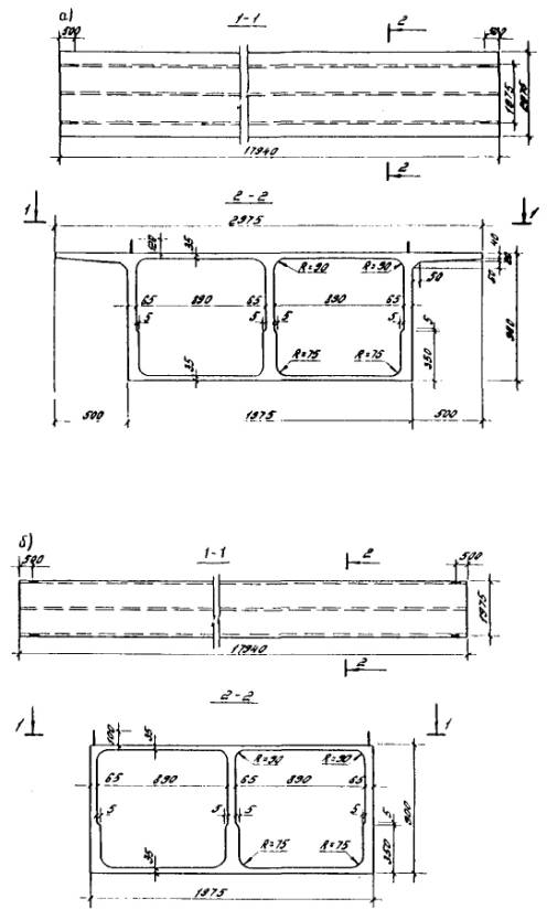 Расчет коробчатого настила с учетом пространственной работы перекрытия Исходные данные. Перекрытие - из предварительно напряженных железобетонных коробчатых настилов; номинальная длина коробчатого настила (рис. 1, а) l = 17,40 м; конструкция изготовлена из тяжелого бетона класса В 40; монолитная армированная бетонная подготовка пола выполнена из бетона класса В 30 и имеет толщину 100 мм; расчетная нагрузка - 6000 Па (без учета собственного веса); временная часть расчетной нагрузки составляет 4000 Па (400 кгс/м2) и приложена на части перекрытия (рис. 1, а). Деформационный пространственный расчет коробчатого настилаПриведенное сечение коробчатого настила с учетом рекомендаций п. 12 дано на рис. 2, а. Стороны треугольных вутов полок определены по формуле (31), толщины верхней полки настила и консоли найдены по формуле (47):