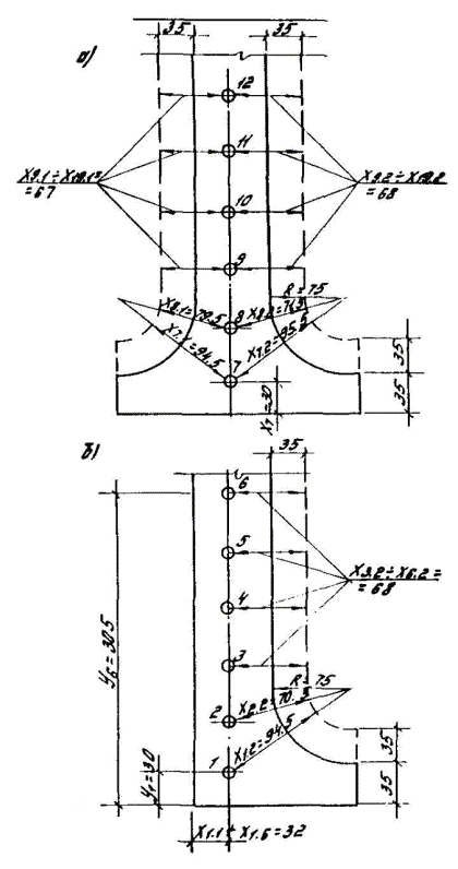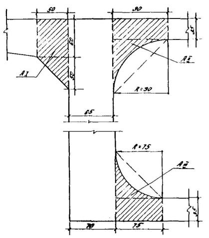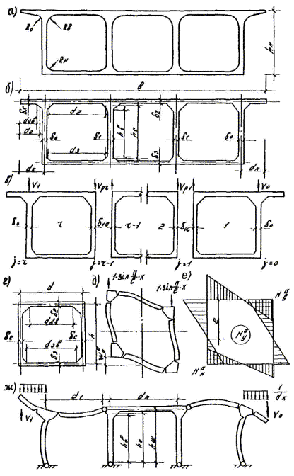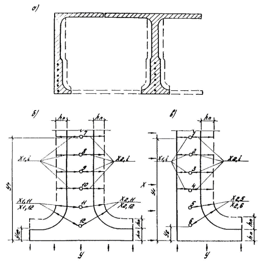 do ;hw, d1- расстояние от осей ребер и полок до шарниров; γ γ = 2; γ1 = 0,75 - при действии нагрузки и γ = γ1 = 1 - при действии реакций; d0 h0, d1- расстояния от центров тяжести вутов до шарниров консолей, ребер и полок (рис. 2, ж);