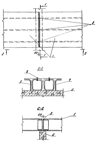 5. РАСЧЕТ КОРОБЧАТОГО НАСТИЛА НА ВОЗДЕЙСТВИЕ УСИЛИЙ, ВОЗНИКАЮЩИХ ПРИ ПОДЪЕМЕ, МОНТАЖЕ И ТРАНСПОРТИРОВАНИИ5.1. При расчете коробчатых настилов на воздействие усилий, возникающих при их подъеме, транспортировании и монтаже, нагрузку от собственного веса конструкции следует вводить в расчет с коэффициентами динамичности, равными соответственно 1,4; 2,7 и 1,4. Коэффициент перегрузки от собственного веса конструкции при указанных расчетах не вводится. 6. ПРОСТРАНСТВЕННЫЙ РАСЧЕТ ПЕРЕКРЫТИЯ С КОРОБЧАТЫМИ НАСТИЛАМИ6.1. Пространственный расчет перекрытия необходимо выполнять при наличии стыков между коробчатыми настилами, установленными в перекрытиях без промежутков, и неравномерных нагрузках, ширина приложения которых в поперечном направлении превышает величину l / 2 (где l - номинальная длина конструкции), а величины временных нормативных нагрузок равны или превышают значения, приведенные в табл. 2. Таблица 2