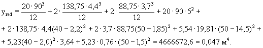 Ared = A + αp Asp + αs As = 3,7 · 197,5 + 4,4 · 297,5 + 20 · 82,3 + 5,54 · 19,81 + 5,23 · 3,64 + 5,23 · 0,76 = 381851 см2 = 0,38 м2; Sred = 297,5 · 4,4 · 87,9 + 197,5 · 1,85 · 37 + 20 · 81,9 · 44,85 + 5,54 · 19,81 · 14,5 + 5,23 · 3,64 · 88 + 5,23 · 0,76 · 1,5 = 187418 см3 = 0,19 м3; Расстояние от центра тяжести приведенного сечения до нижней грани настила: y = Sred / Ared = 0,19 / 0,38 = 0,5 м (50 см);