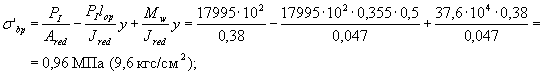 Так как σs6 = 40 · 0,43 = 17,2 МПа (172 кгс/см2); σspII = 874,6 - 17,2 = 857,4 МПа (8574 кгс/см2); PII = 857,4 · 106 · 19,81 · 10-4 = 1698,5 · 102 Н (169850 кгс); l = 0,36 м (36 см). Вторые потери σsp8 = 40 МПа (400 кгс/см2);