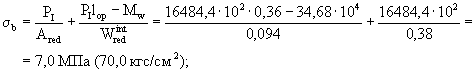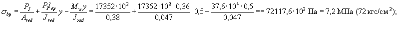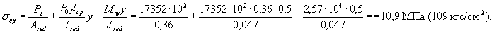 С учетом вторых потерь σspII = 857,4 - 40 - 54,8 = 762,6 МПа (7626 кгс/см2); PII = 762,6 · 106 · 19,81 · 10-4 = 15107 · 102 Н (151070 кгс); l02 = 0,36 м (36 см). Проверка сжимающих напряжений σbp. Наибольшие сжимающие напряжения σbp имеют место в сечении, проходящем через конец приопорной зоны длиной lp, поскольку здесь разгружающее влияние момента наименьшее. Напряжения σbp определяются на уровне нижнего крайнего волокна (т.е. при у = у0 = 0,5 м) при действии усилия PI с учетом первых потерь. PI = 16977,2 · 102 Н;