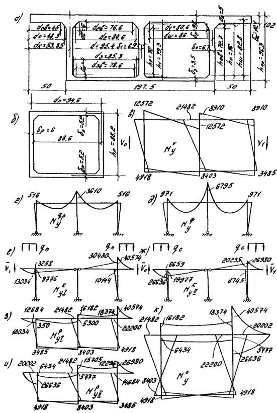 где λ = 1 / (1 + 4Bп h0 / 3 Bp d1.) (49) 27. Моменты в верхней лодке и крайних ребрах от нагрузки и реакций на консолях при наличии шарниров в ребрах и полках крайних пустот (рис. 3, б) рекомендуется определять по формулам: Mn = Mk (1 - λ); Mp = Mk λ; (50) Mk = (q dk2 / 2 + V0(1) dksin π/l x, (51) где Mk - момент в основании консоли полки. Рис. 3. Определение суммарной эпюры поперечных изгибающих моментов в коробчатом настиле а - эпюра от нагрузки на верхнюю полку; б - эпюра от нагрузки и реакций на консолях верхней полки; в - эпюра от реакций на крайних ребрах; г - суммарная эпюра 28. Эпюру моментов Mvy (рис. 3, в) в коробчатом настиле от реакций V0 и V1 необходимо определять путем сложения эпюр (рис. 2, е) в отдельных элементах (рис. 2, в). Значения моментов в узлах среднего и крайних элементов определяются по формулам: 29. Расчетную эпюру поперечных изгибающих моментов Mpy (рис. 3, г) следует определять как сумму трех эпюр May + Mky + Mvy для обоих коробчатых настилов, расположенных по обе стороны границы приложения временной части нагрузки. 30. Огибающая эпюра моментов строится в результате наложения расчетных эпюр в обоих коробчатых настилах, расположенных с двух сторон от границы приложения временной части нагрузки. 31. По значениям ординат огибающей эпюры моментов в сечениях в начале вутов консолей, полок и ребер необходимо проверять условие образования продольных трещин. В случае их образования выполняются повторный деформационный расчет с учетом требований раздела 21, построение огибающей эпюры моментов и подбор поперечной арматуры. 32. Касательные напряжения в ребрах от симметричной составляющей реакции и нагрузки следует определять как для балочных конструкций от асимметричных реакций. Они находятся по формуле
