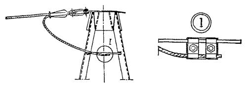 Получаем для hx1 = 9 м, rx = 12,1 м; для hx2 = 12 м, rx = 8 м. Выполняя построение зон защиты молниеотводов графически, видим, что все здание защищается. Следовательно, молниеотводы высотой 20 м можно принять для грозозащиты рассматриваемого здания. Для удобства расчетов можно воспользоваться номограммой для определения высоты двойного стержневого молниеотвода (см. рис. 26), которая позволяет при заданных ha, L и rсх сразу определить необходимую высоту молниеотвода. Пример. Необходимо определить высоту стержневых молниеотводов при защите дома двумя молниеотводами и размерах защищаемого дома: высоте до карниза крыши hх1 = 9 м, до конька крыши hx2 = 12 м, длине 24 м, ширине 18,0 м. Молниеотводы устанавливаются на расстоянии 3 м от стены дома по длинной оси. Дом, подлежащий молниезащите, вычерчиваем в масштабе и наносим места установки молниеотводов (см. рис. 25). По чертежу определяем наименьшую ширину зоны защиты между молниеотводами на уровне hx1 = 9 м, 2rсх = 20 м, (rсх = 10 м), расстояние между молниеотводами L = 30 м. По номограмме рис. 26 для определения высоты двойного стержневого молниеотвода соединяем линией точки, лежащие на прямолинейных шкалах rсх = 10 м и L = 30 м, в точке пересечения с кривой hx1 = 9 м проходит прямая hа1 = 10 м, следовательно, полная высота молниеотвода h = hх1 + hа1 = 9 + 10 м = 19 м. Рисунок 26. Номограмма для определения высоты двойного стержневого молниеотвода Для определения наименьшей ширины зоны защиты между молниеотводами на уровне конька крыши hх2 = 12 м находим: hа2 = h - hх2 = 19 - 12 = 7 м. По номограмме соединяем линией точку прямолинейной шкалы L = 30 м с прямой ha2 = 7 м, в точке ее пересечения с кривой hx2 = 12 м на шкале rсх линия пересекается с точкой 5,5 м. Минимальная ширина зоны защиты двойного стержневого молниеотвода на высоте hx2 = 12 м, 2rсх2 = 11 м, что полностью перекрывает защищаемый объект на этой высоте. Следовательно, высота молниеотвода для защиты объекта достаточна. Принимаем ближайшее значение стандартной высоты молниеотвода h = 20 м. Для графического построения зоны защиты молниеотводов необходимо аналогично вышеизложенному определить 2rсх для hx1 = 9 м и hх2 = 12 м, а радиус внешней зоны защиты молниеотводов легко определить по номограмме по методу, изложенному для случая одиночного стержневого молниеотвода или соответствующей номограмме. Сравнивая результаты первого и второго расчетов для выбора высоты молниеотводов можно сделать вывод, что ошибка может быть незначительной. Поэтому, пользуясь номограммой, выбираем высоту предварительно. Затем уточняем расчетом. 3.3. Зоны защиты тросовых молниеотводов1) Конфигурация зоны защиты одиночного тросового молниеотвода показана на рис. 27. Расчет параметров зоны по первому методу производится по формулам: rx = 1,25(hmp - 1,25hx), м (3) (при hх ≥ 0 и hх ≤ 2/3hтр); rх = 0,625(hmp - hx), м (4) (при hх > 2/3hmp). Рисунок 27. Зона защиты одиночного тросового молниеотвода: 1 - положение троса в зоне закрепления; 2 - положение троса в середине пролета (с учетом стрелы провеса). При этом полная ширина зоны защиты (по аналогии со стержневыми молниеотводами именуемая радиусом защиты) при hx = 0 определяется из выражения 2rx = 2,5hтр, м, (5) где hтр - высота троса (с учетом его стрелы провеса) над защищаемым домом, м. На рис. 28 приведена номограмма, по которой в зависимости от заданных величин h, hx и L можно легко найти искомое значение rx. Торцевые области зоны защиты тросового молниеотво