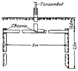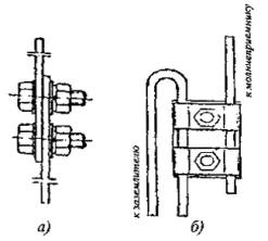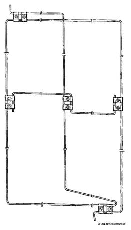 Как видим, результат сравнительно мало отличается от величины сопротивления, полученной с помощью приближенного расчета. Заземлитель, имеющий импульсное сопротивление не более 10 Ом, может быть выполнен без стержневых электродов только с помощью полос. Как было определено выше, сопротивление на переменном токе полосы, уложенной на глубине 0,6 м в грунт с ρ = 100 Ом · м, равно 24,6 Ом. Для двух полос по табл. 3αИ = 0,65, а ηИ = 1 (см. выше). Таким образом, импульсное сопротивление заземлителя из двух полос, расходящихся в противоположные стороны от точки присоединения токоотвода, составляет: