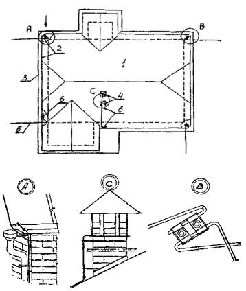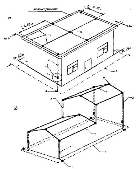 Таким образом, высота тросового молниеприемника в отклоненном положении в общем случае определится выражением h'mp = hmp + Δhmp, м. (12) Из приведенных выше соображений по расчету зоны защиты тросового молниеотвода становится понятным, что: 1) расчетом должен заниматься специалист; 2) сложность конструктивного исполнения тросового молниеотвода, его влияние на архитектурные формы дома и высокая стоимость не приведут к массовому применению. Поэтому примеры расчета в книге не приводятся. 3.4. Зона защиты сетчатого молниеотводаСетчатые молниеотводы обладают достаточно высокой степенью надежности молниезащиты и по своим экономическим показателям, связанным с расходом металла, могут превосходить стержневые и тросовые молниеотводы. Однако в некоторых случаях, при невозможности использования других типов молниеотводов, они могут оказаться даже экономически выгодными или единственно возможными по конструктивным соображениям, или ради сохранения эстетического (архитектурного) облика дома. Сетчатые молниеотводы устанавливаются на защищаемом доме. Их защитная зона - все, над чем они установлены (см. рис. 31). Основными недостатками сетчатых молниеотводов можно считать следующие: 1. Повышенный расход металла; 2. Невозможность непосредственной укладки по сгораемым кровлям; 3. Необходимость укрытия под кровлю для обеспечения беспрепятственной чистки кровли от снега и льда; 4. Возможный прожог кровельного материала при прямом разряде молнии; 5. Необходимость удаления заземленных элементов в доме от сетки и токоотводов на расстояние до 1 м из-за возможных перекрытий во время разряда молнии; 6. Необходимость установки стержневых молниеприемников на выступающих над сеткой конструктивных элементах дома (дымоходы, трубы, антенны и т.п.). 3.5. Зона защиты покровного молниеотводаВ последние годы все больше сооружается коттеджей с металлической кровлей. Это и традиционные способы покрытия металлическими листами со сборкой их с помощью кровельного шва, с применением гофрированных листов металла, металлочерепицы. С точки зрения использования таких покрытий в качестве молниеприемников следует четко различать их способность к приему и отводу молнии в землю. Рисунок 31. Примеры устройства сетчатых молниеотводов: а) на односкатной крыше; б) на двухскатной двухуровневой; 1 - проводник молниеприемника сетчатого молниеотвода; 2 - токоотвод; 3 - сварной контакт токоотвода с заземлителем; 4 - соединительный зажим для замера сопротивления заземлителя; 5 - протяженный заземлитель; 6 - соединительный зажим молниеприемника. Кровли, собранные с помощью кровельного шва, и кровли из гофрированных листов, собранные таким образом, что все листы имеют металлическую связь между собой через элементы крепления к обрешетке (например, винтами-саморезами) и необходимое количество токоотводов - могут использоваться в качестве молниеприемников (см. рис. 8). Естественно, что при прямом разряде молнии возможен прожог металла в месте разряда. Но, учитывая, что молнии будут поражать дом далеко не каждый год, эта неприятность, легко устранима. Другое дело металлочерепица. Изолированная поверхность листов металлочерепицы при правильном крое (на поставляющей фирме) и правильной укладке по обрешетке с закреплением винтами-саморезами по выпуклости, создает некоторое контактное сое