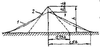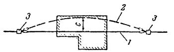 Величина fn определяется из формулы (8) Рисунок 30. К расчету отклонения тросового молниеприемника: 1 - первоначальное положение троса; 2 - положение троса в отклоненном состоянии; 3 - несущие конструкции молниеотвода. При расчетах тросовых молниеприемников иногда необходимо учитывать также увеличение высоты молниеприемника hтр при его отклонении под воздействием ветрового напора на некоторую величину Δhтр. В ряде случаев, особенно при больших скоростях ветра, для пролетов свыше 100 м и определенном сочетании геометрических форм защищаемого дома значение Δhтр может быть настолько существенным, что ввод в расчет этой величины становится необходимым. Значение Δhтр для таких условий следует вычислять по формуле