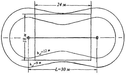 высота зоны защиты между молниеотводами Метод определения высоты двойного стержневого молниеотвода по номограмме рис. 24 требует неоднократных расчетов. Пример. Необходимо определить высоту двух стержневых молниеотводов для защиты здания прямоугольной формы, указанного на рис. 25. Исходные данные: длина здания - 24 м, ширина 18,0 м, высота до карниза крыши hx1 = 9 м, высота до конька крыши hx2 = 12 м. Вычерчиваем план здания в масштабе и наносим наиболее удобное расположение молниеотводов. Определяем по плану расстояние между молниеотводами и получаем L = 30 м. Рисунок 25. Зона защиты здания двумя стержневыми молниеотводами Линия конька крыши в нашем примере совпадает с линией, соединяющей оба молниеотвода, поэтому наименьшую зону защиты между молниеотводами можно принять для hx2 = 12 м, 2rсх = 0. При этом,