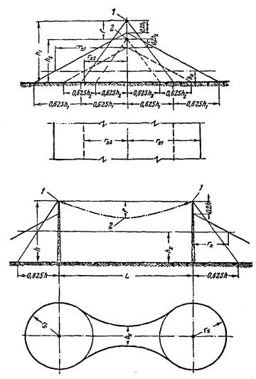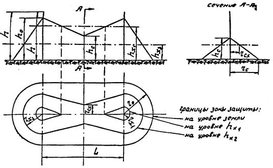 защиты двух стержневых молниеотводов высотой h для Минимальная