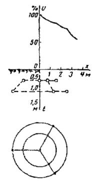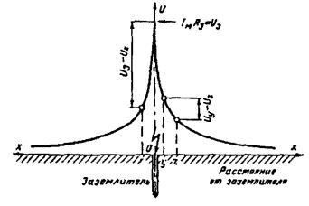Импульсное сопротивление заземления не может быть измерено. После монтажа заземлителя его сопротивление измеряется только на переменном токе. Для этой цели служат измерители заземления типа МС-07 и МС-08 и мегаомметры ЭСО 202-2, ЭК 4304 и т.п. Зная требуемую расчетную величину импульсного сопротивления RИ можно определить предельно допустимую величину сопротивления заземления RЗ., измеренного на переменном токе для разных грунтов (табл. 4), и, наоборот, по величине RЗ. можно найти величину соответствующего RИ. Поперечное сечение заземляющих электродов должно быть не меньше 50 мм2, при этом толщина полос, стенок труб или профильной стали должна быть не меньше 4 мм. В целях защиты от коррозии желательно применение оцинкованной стали. Покраска или покрытие битумом заземляющих электродов не допускается. Верхний слой земли в летнее время сильно высыхает, что увеличивает сопротивление заземлителя, поэтому не только полосы должны закладываться на глубину не менее 0,5 м, но и стержни рекомендуется забивать так, чтобы их верхний край находился на расстоянии около 0,5 м от поверхности земли. Отдельные электроды стержневого заземлителя объединяются общей стальной полосой сечением не менее 48 мм или стальным проводником круглого сечения диаметром не менее 10 мм. Соединение электродов с объединяющей полосой, а также присоединение к заземляющему устройству токоотводов предпочтительнее при помощи сварки. Можно также применять болты, но не менее двух в каждом месте соединения, при этом все элементы заземлителя и соединяющие их болты должны иметь антикоррозийное покрытие. К заземляющему устройству следует присоединить проходящие поблизости от него металлические трубопроводы, если они есть (водяные, отопительные, канализационные), и если они не предназначены для горючих газов и жидкостей и не имеют антикоррозийных покрытий. Подземные трубопроводы из-за их большой протяженности могут обладать очень низким сопротивлением заземления, что следует использовать для уменьшения сопротивления заземления. Подземные трубопроводы (особенно водопровод), естественно, во многих случаях могут быть использованы в качестве единственного заземляющего устройства. Помимо трубопроводов в качестве заземлителей могут быть использованы также обсадные трубы артезианских колодцев и скважин, металлические ограды и т.п. Сопротивление такого рода заземлителей во многих случаях настолько мало (RЗ. < 2 Ом), что они могут также использоваться в качестве единственного (общего) заземляющего устройства. Создание искусственных заземляющих устройств из стержней или полос, имеющих такую величину сопротивления, затруднительно. При прохождении тока молнии как на самом заземлителе, так и на окружающих заземлитель участках поверхности земли появляются электрические потенциалы. Наиболее высокий потенциал UЗ = IMRЗ.И. возникает непосредственно на заземлителе. По мере удаления от заземлителя потенциал на поверхности земли уменьшается (рис. 34). Вблизи заземлителя потенциал уменьшается очень резко, затем изменение потенциала замедляется. Рисунок 34. Изменение потенциала вблизи заземлителя при прохождении через него тока молнии Резкое падение потенциала вблизи заземлителя опасно для людей, оказавшихся поблизости от него во время разряда молнии. Если человек стоит на некотором р