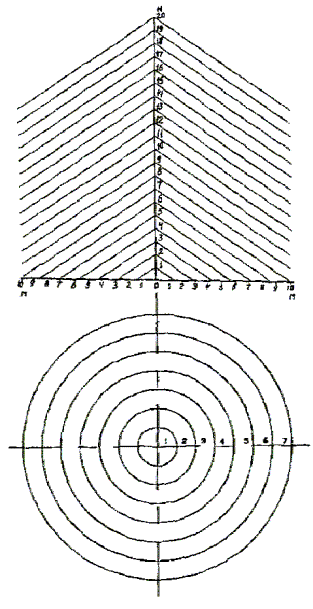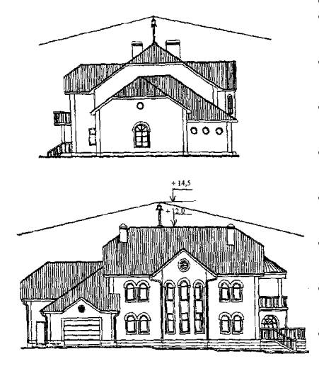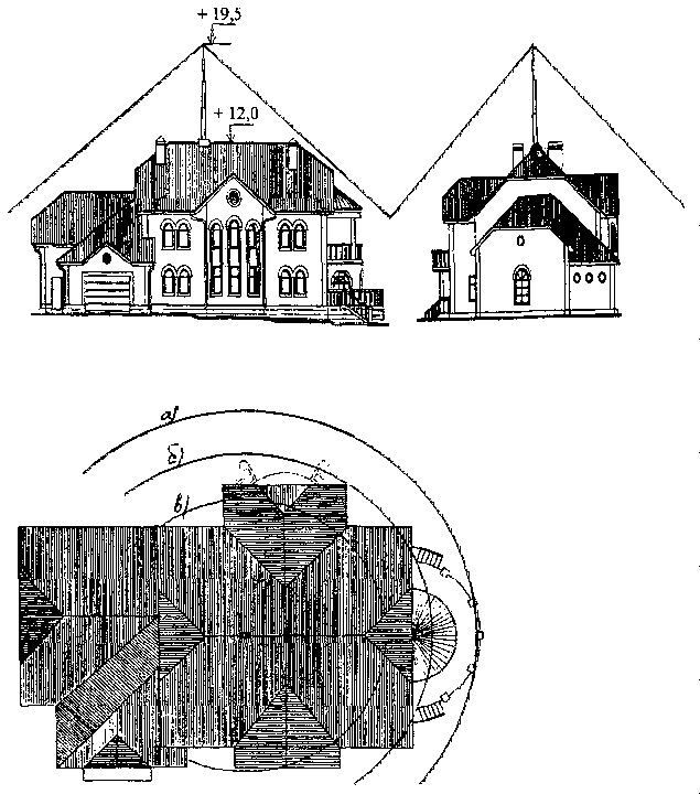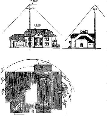 м, тогда Следовательно, в этом случае величина h определяется по I шкале. По номограмме (см. рис. 39) величинам hx и rх соответствует величина h, равная 12 м. Пример 2. Дано: hх = 16 м, rх = 4 м, тогда Следовательно, величину h нужно определять по шкале II. По номограмме данным величинам hx и rх соответствует величина h, равная 21 м. На рис. 40 приведена номограмма для определения высоты двойного стержневого молниеотвода. Она состоит из вертикальной шкалы (слева) с величинами h0 горизонтальной шкалы (внизу) с величинами L и целого ряда значений величины h, изображенных кривыми линиями. Определение высоты двойного стержневого молниеотвода производится следующим образом. По номограмме (см. рис. 39) способом, изложенным выше, для определения высоты одиночного стержневого молниеотвода, определяются точки на шкале I или II, но при этом вместо rх задается величина rсх. Рисунок 40. Номограмма для определения высоты двойного стержневого молниеотвода Величины, найденные по шкале I или II, в этом случае дадут не искомую высоту двойного стержневого молниеотвода h, а высоту зоны защиты в середине между молниеотводами h0, пользуясь которой, можно по номограмме (см. рис. 40) уже определить искомую высоту h. Делается это следующим образом. На вертикальной шкале (слева) отмечается найденная величина h0, а на горизонтальной - величина L. Через отмеченные точки проводят взаимно перпендикулярные линии, точка пересечения которых укажет кривую линию с обозначенной на ней искомой величиной h. Если эта точка окажется между кривыми, то за необходимую величину h нужно принять промежуточное или большее ближайшее значение. Пример 1. Дано: hx = 8 м, rсх = 6 м, L = 40 м. Находим h0, по номограмме (см. рис. 39). Отношение, Пример 2. Дано: hх = 12 м, rсх = 3 м, L = 45 м. Находим h0 по номограмме (см. рис. 39). Отношение, Для проектировщиков молниезащиты индивидуальных жилых домов, коттеджей и подсобных сооружений в целях упрощения выбора высоты одиночного или двойного стержневого молниеотвода можно применить, кроме приведенных номограмм, также графический метод предварительного определения его высоты и места установки. Особенно удобно этим методом пользоваться в случае выбора защиты для построенного дома. При этом Вы можете определить высоту как отдельно стоящего, так и установленного на доме молниеотвода. Для этого необходимо определиться с уровнем (категорией) защиты дома*; защитным углом, соответствующим выбранному уровню защиты и высоте молниеотвода. * При определении категории защиты дома по желанию его владельца проектировщиком может быть принята любая категория защиты. После этого в одном масштабе с чертежом дома на кальке необходимо построить номограмму-график, подобно приведенной на рис. 41, в вертикальной и горизонтальной плоскостях. Рисунок 41. Номограмма-график для определения защитных зон молниеотводов Имея чертеж дома, накладываете на него номограмму и двигая вверх-вниз находите минимальную высоту молниеотвода, в защитную зону которого войдут все защищаемые элементы дома. Перенося защитные зоны выбранного молниеотвода на различных уровнях hх защиты элементов дома на план дома, определяете точку места установки молниеотвода. После этого можете убедиться в правильности выбора по номограммам (рис. 22, 24, 26) и окончательно принять решение с помощью расчета по формулам, приведенным в РД. При сложной конфиг