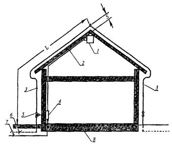 1 - электроприемник; 2 - электропроводка; 3 - токоотвод; 4 - ВРУ или РЩ; 5 - соединительный зажим для замера сопротивления заземлителя; 6 - заземлитель (искусственный); 7 - кабель ввода; 8 - естественный заземлитель (арматура); L - длина токоотвода; S - воздушный промежуток между токоотводом и элементом электроустановки дома.