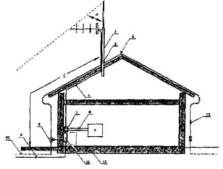 1 - металлическая стойка антенны с молниеприемником; 2 - молниеприемник сетчатого (струнного) молниеотвода; 3 - зажим присоединения стойки к токоотводу; 4 - кабель антенны; 5 - главная заземляющая шина; 6 - соединительный зажим для замера сопротивления заземлителя; 7 - телевизионное оборудование; 8 - параллельная прокладка кабелей антенны и электропроводки; 9 - кабель ввода; 10 - заземлитель; 11 - ВРУ или РЩ; 12 - заземлитель фундамента; 13 - токоотвод; L - длина токоотвода; ОС - защитный угол.
