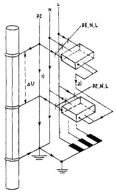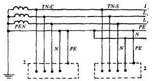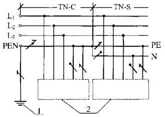 Рис. 1.2. Система TN-C-S (в части сети нулевой рабочий и нулевой защитный проводники объединены) 1 - заземлитель источника питания; 2 - открытые проводящие части