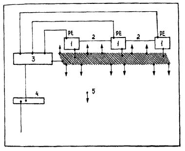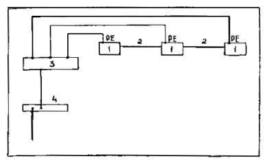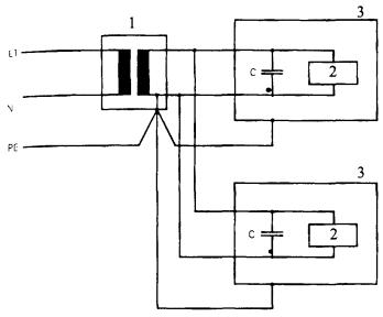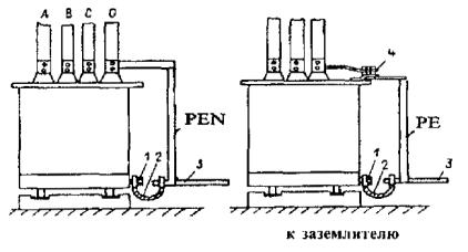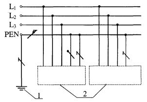 Рис. 1.3. Система TN-C (нулевой рабочий и нулевой защитный проводники объединены по всей сети) 1 - заземлитель источника питания; 2 - открытые проводящие части