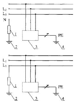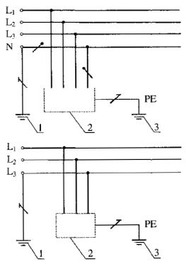 Рис. 1.4. Система ТТ 1 - заземлитель источника питания; 2 - открытые проводящие части; 3 - заземлитель корпусов оборудования Рис. 1.5. Система IT 1 - сопротивление; 2 - заземлитель источника питания; 3 - открытые проводящие части; 4 - заземлитель корпусов оборудования 1.3. Общие требования электробезопасности электроустановокОсновное правило устройства электроустановок1.1. Все электроустановки переменного и постоянного тока напряжением до 1 кВ и выше должны удовлетворять требованиям основного правила устройства электроустановок: Опасные токоведущие части электроустановки не должны быть доступны для непреднамеренного прямого прикосновения к ним, а доступные прикосновению открытые проводящие части, сторонние проводящие части, защитные проводники и заземляющие проводники (РЕ-проводники), а также открытые токоведущие части цепей обратного тока, включая PEN-проводники, не должны быть опасны при прямом прикосновении к ним как при нормальном режиме работы, так и при повреждении изоляции опасных токоведущих частей. Напряжение шага на территории электроустановки и в пределах зоны растекания тока с заземлителя в землю не должно быть опасно как при нормальном режиме работы, так и при повреждении изоляции опасных токоведущих частей. Кроме того, опасные токоведущие части электроустановки напряжением до 1 кВ не должны быть опасны при случайном непреднамеренном прямом прикосновении к ним при нормальном режиме работы. Токи токоведущих и проводящих частей электроустановки и - сторонних проводящих частей, Ii, а также сосредоточенный ток утечки с опасных токоведущих частей электроустановки в землю IΔ, не должны превышать предельно допустимых значений [Ii] и [IΔ], соответственно, с учетом длительности нагрева этих частей при всех возможных режимах работы электроустановки, включая повреждение изоляции токоведущих частей. Для обеспечения сформулированного требования должны быть применены защита от сверхтока в токоведущих и проводящих частях и защита от превышения сосредоточенным током утечки предельно допустимого значения [IΔ] с учетом длительности протекания этих токов при всех возможных режимах работы электроустановки, включая повреждение изоляции токоведущих частей. В качестве защиты от сверхтока должно быть использовано автоматическое отключение, в том числе с применением устройств зашиты, реагирующих на дифференциальный ток. В качестве защиты от превышения сосредоточенным током утечки IΔ предельно допустимого значения [IΔ] должны быть применены устройства защиты, реагирующие на дифференциальный ток с номинальным отключающим дифференциальным током IΔn, не превышающим 300 мА. Для защиты от поражения электрическим током в электроустановках напряжением до 1 кВ и выше должны быть применены основная защита от непреднамеренного прямого прикосновения к опасным токоведущим частям и защита при прямом прикосновении к открытым проводящим частям, сторонним проводящим частям, защитным проводникам и заземляющим проводникам (РЕ-проводникам), а также к открытым токоведущим частям цепей обратного тока, включая PEN-проводники, в нормальном режиме работы, а также при повреждении изоляции опасных токоведущих частей электроустановки. В электроустановках до 1 кВ для защиты от поражения электрическим током должна быть применена дополнительная защи