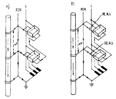 Рис. 2.2.1.Б. Классификация проводников (круговая диаграмма) 6) системы, обслуживающие установки зданий, например, системы прямого цифрового контроля; 7) системы компьютерного контроля производства и другие компьютерные устройства. Фильтры подавления радиопомех, которыми оснащается информационно-технологическое оборудование, могут вызывать появление токов утечки, превышающих 3,5 мА. В таких случаях обрыв Цепи защитного заземления приводит к росту напряжения прикосновения до значений, превышающих предельно допустимые. Требования пп. 2.2.18. - 2.2.25., направленные на предотвращение этой опасности, относятся к электроустановкам, питающим информационно-технологическое оборудование с токами утечки, превышающими 3,5 мА. В дальнейшем такое оборудование будем называть информационно-технологическим оборудованием с большими токами утечки. Заземление электроустановок, питающих информационно-технологическое оборудование с большими токами утечки, должно соответствовать общим требованиям настоящего раздела с учетом требований 2.2.18. - 2.2.25., которые дополняют общие требования. Требования настоящего раздела распространяются на электроустановки зданий до места присоединения информационно-технологического оборудования (рис. 2.2.3). Рис. 2.2.2. Защитное и рабочее заземления в системе TN. В дальнейшем изложении будем использовать следующую терминологию: Информационно-технологическое оборудование - блоки электроаппаратуры, которые раздельно или собранные в системы накапливают, запоминают и преобразовывают информацию. Ввод и вывод информации может осуществляться с помощью электронных приборов. Система уравнивания потенциалов с низкими помехами - система уравнивания потенциалов, при которой уровень гальванических влияний внешних источников не вызывает недопустимых нарушений в работе информационно-технологического оборудования. В этом разделе под термином «рабочее (функциональное) заземление» понимается использование земли и уравнивающих проводников для целей передачи сигналов и для обеспечения электромагнитной совместимости (ЭМС). Главный заземляющий зажим 2.2.1. В тех случаях, когда цепи БСНН, ЗСНН и доступные проводящие части оборудования класса II и класса III заземлены для рабочих (функциональных) целей, они должны быть соединены с системой уравнивания потенциалов в соответствии с требованиями раздела 2.1. (рис. 2.2.4). Рабочее (функциональное) заземление может быть обеспечено посредством защитного проводника питающей цепи информационно-технологического оборудования. В ряде случаев роль рабочего (функционального) заземляющего проводника и защитного проводника выполняет специальный совмещенный проводник, соединенный с главным заземляющим зажимом здания. Рис. 2.2.3. Питающая электроустановка и информационно-технологическое оборудование 1 - электроустановка; 2 - информационно-технологическое оборудование (ИТО); 3 - разъемное контактное соединение для тока промышленной частоты; 4 - присоединенное ИТО; 5 - соединительная коробка; 6 - соединительные зажимы Рис. 2.2.4. Уравнивание потенциалов проводящих частей, доступных одновременному прикосновению 1 - открытые проводящие части; 2 - доступные проводящие части, заземленные для рабочих (функциональных) целей; 3 - сторонние проводящие части; 4 - оборудование класса I; 5 - оборудование классов I, II, III; 6 
