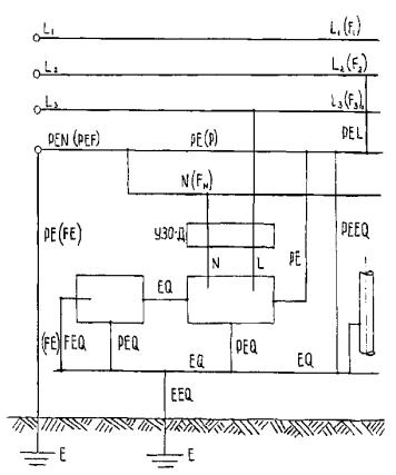 2.2. Информационно-технологические установкиНастоящий раздел содержит специальные требования к заземлению информационно-технологических установок с целью обеспечения их нормальной работы. Заземление информационно-технологических установок должно соответствовать общим требованиям раздела 2.1 с учетом требований настоящего раздела, которые дополняют общие требования. Классификация проводников, используемая в настоящем и в последующих разделах книги, дана в табл. 2.2.1. и в виде структурной схемы на рис. 2.2.1.А, 2.2.1.Б, 2.2.2., где приняты следующие обозначения: E - заземляющий; Р - защитный; EQ - уравнивающий; F - рабочий; N - нулевой рабочий; L - фазный; FE - заземленный рабочий; РЕ - заземленный защитный; PEQ - уравнивающий защитный; PEEQ - заземленный уравнивающий защитный; FEQ - уравнивающий рабочий; EEQ - заземленный уравнивающий; PEF - совмещенный заземленный защитный и заземленный рабочий; PEL - совмещенный заземленный защитный и заземленный фазный; PEN - совмещенный заземленный (нулевой) защитный и заземленный (нулевой) рабочий; ЕН (Н) - выравнивающий; РЕН - защитный выравнивающий; LPE - молниезащитный. В табл. 2.2.2. даны наименьшие размеры поперечного сечения защитных (РН, PEEQ, РЕН, Е2) и молниезащитных (LPE, LPEEQ, LPEH, EΣ) неизолированных стальных проводников, не защищенных от коррозии и не имеющих механической защиты. Требования настоящего раздела распространяются на заземление и уравнивание потенциалов информационно-технологического оборудования и аналогичного оборудования, использующего проводные линии для целей передачи информации. Эти требования могут быть также применены для другого электронного оборудования, которое чувствительно к электромагнитным влияниям. Принципиальная схема защитного и рабочего заземлений в системе TN дана на рис. 2.2.2. Заметим, что оборудование информационных технологий включает все формы электрического и электронного конторского оборудования и телекоммуникационного оборудования. В качестве примеров оборудования, на которое распространяются требования настоящего раздела, отметим следующие: 1) телекоммуникационные и информационные линии связи или оборудование информационных технологий, или установок, использующих сигналы с возвратом тока через землю в наружных линиях связи и линиях связи внутри зданий; 2) сети питания постоянного тока, обслуживающие оборудование информационных технологий внутри зданий. 3) местные сети автоматического обмена информацией между отдельными установками; 4) местные сети связи; 5) системы пожарной сигнализации и другие системы аварийной сигнализации; Таблица 2.2.1. Классификация проводников
