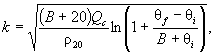 где: Qc - объёмная теплоёмкость материала проводника, Дж/ °С · мм3; B - величина, обратная температурному коэффициенту сопротивления проводника при 0 °С; °С; ρ20 - удельное электрическое сопротивление материала проводника при 20 °С, Ом · мм; θi - начальная температура проводника, °С; θf - конечная температура проводника, °С.