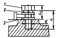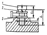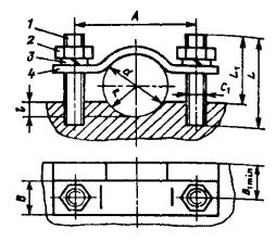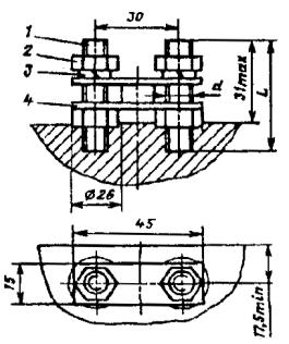 7.67. Способы присоединения заземляющих проводников к корпусам силового оборудования указаны в табл. 7.13. 7.68. Места присоединения и крепления заземляющих и нулевых защитных проводников к силовому оборудованию даны в ГОСТ 21130-75*. Рис. 7.8. Зажим типа ЗШ2П: 1 - шпилька; 2 - гайка; 3 - пружинная шайба; 4 - пластина