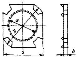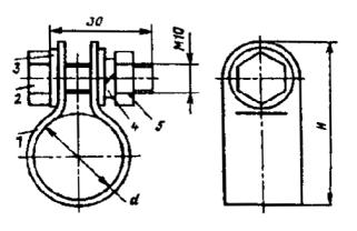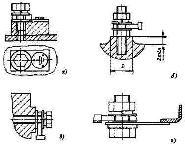 Рис. 7.8. Зажим типа ЗШ2С: 1 - шпилька; 2 - гайка; 3 - пружинная шайба; 4 - скоба Рис. 7.10. Зажим типа ЗБХ: 1 - хомут; 2 - болт; 3 - стальная шайба; 4 - шайба пружинная; 5 - гайка Рис. 7.11. Зажим типа ЗБ2: 1 - скоба; 2 - болт; 3 - стальная шайба; 4 - шайба пружинная; 5 - гайка 7.69. Установочные заземляющие гайки (табл. 7.14.) применяются для создания электрического контакта между корпусом аппарата или электроконструкции и стальными трубами, патрубками (табл. 7.15.). Гайки устанавливаются по обе стороны стенки корпуса, при этом острые выступы должны быть обращены к этой стенке. Рис. 7.12. Варианты установки зажимов: а - на прямоугольное изделие; б - на прилив; в - на приливе, установленном сбоку изделия; г - на листовом корпусе Рис. 7.13. Заземляющая установочная гайка Рис. 7.14. Вводный патрубок Таблица 7.14. Размеры и массы установочных заземляющих гаек (рис. 7.13)