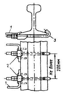 б) соединение арматуры подколонника с арматурой подошвы должно быть выполнено сваркой; в) если пространственный каркас подколонника не пересекается с арматурными сетками подошвы фундамента, то его следует нарастить в двух местах с помощью отдельных арматурных стержней и соединить их сваркой с арматурными сетками; г) если подошва фундамента не армируется, то достаточно соединить сваркой арматуру подколонника и фундаментные болты; д) все стержни каркаса арматуры фундамента должны быть соединены между собой сваркой; е) пластины размером 50´100 мм2 должны иметь толщину более 5 мм для приварки проводников заземления. Расстояние от пластины до уровня чистого пола должно быть не более 500 мм. Сварной шов выполняют по ширине пластины с двух сторон. 8.7. Естественные заземлители должны быть связаны с магистралями заземлений не менее чем двумя проводниками, присоединенными к заземлителю в разных местах (рис. 8.3). Это требование не распространяется на опоры воздушных линий электропередачи (ВЛ), повторное заземление PEN-проводника и металлические оболочки кабелей. 8.8. В случае использования естественных заземлителей (особенно протяженных) при выборе мест присоединения к ним защитных проводников необходимо учитывать возможность разъединения заземлителя, например, при ремонтных работах. Рис. 8.1. Соединение арматуры железобетонных конструкций: 1 - молниеприемная сетка; 2 - токоотвод; 3 - арматура колонны; 4 - заземляющая перемычка; 5 - арматура фундамента Рис. 8.2. Соединение металлической колонны с арматурой железобетонного фундамента: 1 - арматура подошвы; 2 - арматура фундамента; 3 - фундамент; 4 - фундаментные болты (не менее двух), соединенные с арматурой фундамента; 5 - пластины для приварки проводников заземления; 6 - стальная колонна Использование железобетонных фундаментов в качестве заземлителей в агрессивных средах8.9. Допускается использование фундаментов в качестве заземлителей в агрессивной среде при концентрации ионов хлора до 0,5 г/л (Cl) или сульфат-ионов до 10,0 г/л (SO4) в том случае, если плотность токов, длительно стекающих с арматуры фундамента, не превышает 1 А/м2. Рис. 8.3. Присоединение к тяговому рельсу проводников защитного заземления: 1 - провод заземления; 2 - зажим заземления; 3 - крюковой болт Искусственные заземлители8.10. Для искусственных заземлителей и устройств выравнивания потенциала следует применять, как правило, оцинкованную сталь. Искусственные заземлители не должны иметь окраски. 8.11. Наименьшие размеры стальных заземлителей при низкой коррозионной активности грунтов приведены ниже: Диаметр круглых (прутковых) заземлителей, мм.............................................................. 10 Сечение прямоугольных заземлителей, мм2...................................................................... 100 Толщина прямоугольных заземлителей, мм....................................................................... 4 Толщина полок угловой стали, мм....................................................................................... 4 В случае опасности повышенной коррозии для заземлителей следует использовать оцинкованную сталь круглого профиля и повышенного сечения. Наименьшее сечение стальных заземлителей в зависимости от агрессивности грунта дано в табл. 8.2. Сечение горизонтальных заземлителей для электроустановок напряжением выше 1 кВ выбирается по термической стойкости. 8.12. Не следует располагать (использовать) заземлители в местах, где земля подс