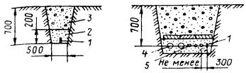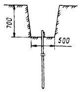 8.13. Вертикальные заземлители приведены на рис. 8.4. Длина вертикальных электродов определяется проектом, но не должна быть менее 1 м; верхний конец вертикальных заземлителей должен быть заглублен, как правило, на 0,5 - 0,7 м. 8.14. Горизонтальные заземлители используют для связи вертикальных заземлителей или в качестве самостоятельных заземлителей. Глубина прокладки горизонтальных заземлителей - не менее 0,5 - 0,7 м. Меньшая глубина прокладки допускается в местах их присоединений к оборудованию, при вводе в здания, при пересечении с подземными сооружениями и в зонах многолетнемерзлых и скальных грунтов. Горизонтальные заземлители из полосовой стали следует укладывать на дно траншеи на ребро (рис. 8.5). 8.15. Горизонтальные заземлители в местах пересечения с подземными сооружениями, железнодорожными путями и дорогами, а также в других местах возможных механических повреждений, следует защищать металлическими или асбоцементными трубами. Рис. 8.4. Установка вертикальных заземлителей Рис. 8.5. Прокладка горизонтальных заземлителей в траншее (а) и совместно с кабелем (б): 1 - полоса; 2 - мягкий грунт; 3 - грунт; 4 - силовые кабели; 5 - контрольные кабели Прокладку заземлителей параллельно кабелям или трубопроводам следует выполнять на расстоянии не менее 0,3 м, а при пересечениях - не менее 0,1 м. Траншеи для горизонтальных заземлителей должны быть заполнены сначала однородным грунтом, не содержащим щебня и строительного мусора, с утрамбовкой на глубину 200 мм, а затем - местным грунтом. 8.16. Если диаметр горизонтального стального заземлителя меньше 12 мм, то необходимо при расположении этого заземлителя ближе, чем 0,3 м от железобетонного фундамента, изолировать часть заземлителя на расстоянии в обе стороны от фундамента до 0,5 м. 8.17. Места входа в грунт заземлителей и места пересечения ими грунтов с различной воздухопроницаемостью рекомендуется гидроизолировать. При пересечении трасс кабелей, имеющих свинцовую или алюминиевую оболочку, с трассой горизонтального стального заземлителя, если оба элемента прокладывают непосредственно в грунте, расстояние между заземлителем и кабелем в местах пересечения должно быть выбрано не менее 1 м. При невозможности выполнения этого требования кабель рекомендуется прокладывать максимально близко к заземлителю и его оболочку следует дополнительно соединить с заземлителем. Место соединения необходимо гидроизолировать. Гидроизоляцию можно выполнить при помощи противокоррозийных лент, полихлорвиниловых обмоток и тафтяных лент с пропиткой их горячим битумом. Верхняя точка наложения изоляции должна находиться на 10 - 15 см выше поверхности грунта, нижняя - на том же расстоянии ниже уровня поверхности или под слоем раздела грунтов в случае их неоднородности. Расчет сопротивления контурного заземлителя8.18. Сопротивление растеканию заземляющего устройства выполненного в виде контурного заземлителя, состоящего из горизонтальной сетки и вертикальных электродов, рассчитывается по формуле: