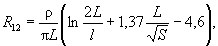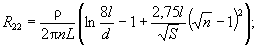 где R11 - сопротивление растеканию горизонтальной сетки, Ом; R22 - сопротивление растеканию вертикальных электродов, Ом; R12 - взаимное сопротивление между горизонтальной сеткой и вертикальными электродами, Ом. Сопротивления R11, R22, R12 определяются выражениями: