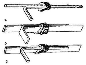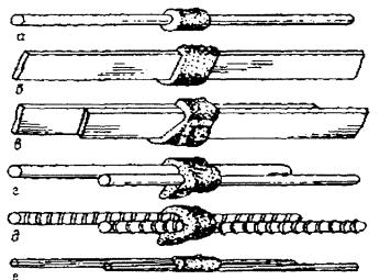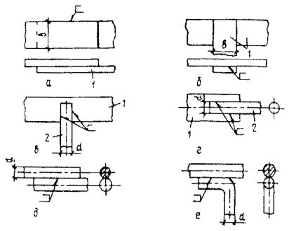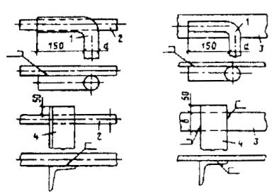 Монтаж заземлителей8.22. До начала электромонтажных работ строительная организация должна закончить работы по планировке, рытью траншей или котлованов. Работы по соединению арматуры фундаментов с арматурой колонн должна выполнять строительная организация по строительному заданию к проекту, выданному проектировщиками-электриками. Замоноличиваемые соединения внутри арматуры железобетонных изделий должны быть переданы строителями по акту скрытых работ заказчику. 8.23. Конструктивные узлы и транспортабельные части заземлителей должны быть изготовлены в мастерских электрозаготовок. 8.24. Заземлители должны быть очищены от ржавчины, следов масла и т.д. Погружение электродов в грунт следует выполнять с помощью специальных приспособлений. 8.25. Соединение частей заземлителя, а также соединение заземлителей с заземляющими проводниками следует выполнять при помощи сварки (рис. 8.6, 8.7). Сварные швы, расположенные в земле, следует покрывать битумным лаком. Рис. 8.6. Соединение заземляющих проводников с вертикальными заземлителями: 1 - стержневой заземлитель; 2 - заземляющий проводник из круглой стали; 3 - заземляющий проводник из полосовой стали; 4 - заземлитель из угловой стали 8.26. Присоединение заземляющих проводников к трубопроводам должно осуществляться либо сваркой, либо с помощью хомута (рис. 8.8). Присоединение к трубопроводу заземляющего проводника с помощью хомута следует применять только в случае невозможности присоединения заземляющих проводников сваркой. При установке хомутов контактная поверхность трубопровода Должна быть зачищена до металлического блеска, а контактная поверхность хомутов - облужена. Хомуты должны быть изготовлены из полосовой стали шириной не менее 40 мм и толщиной 4 мм. Присоединение заземляющего проводника к хомуту следует выполнять сваркой. Рис. 8.7. Соединение заземляющих проводников с горизонтальными заземлителями: а - продольное соединение проводников из полосовой стали; б - ответвление проводника из полосовой стали; в - ответвление проводника из круглой стали; г - продольное соединение проводников из полосовой и круглой стали; д - продольное соединение проводников из круглой стали; е - ответвление проводника из круглой стали; 1 - стальная полоса; 2 - сталь круглая 8.27. При работе на отдаленных объектах и линиях электропередачи рекомендуется соединение частей заземлителей с заземляющими проводниками выполнять термитной сваркой (рис. 8.9, 8.10). 8.28. После монтажа заземляющих устройств перед засыпкой траншеи должен быть составлен акт на скрытые работы, а также паспорт на заземляющее устройство. Рис. 8.8. Присоединение заземляющего проводника к трубопроводу сваркой (а - в) и с помощью хомута (г): 1 - заземляющий проводник из полосовой стали; 2 - трубопровод; 3 - заземляющий проводник из круглой стали; 4 - хомут Рис. 8.9. Соединение стальных полос и стержней, выполненные термитной сваркой Рис. 8.10. Ответвления стальных заземляющих проводников, выполненные термитной сваркой Паспорт на заземляющее устройство должен содержать схему заземления, основные технические данные, данные о результатах проверки состояния заземляющего устройства, о характере ремонтов и изменений, внесенных в данное устройство. Форма № 47
