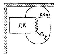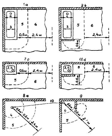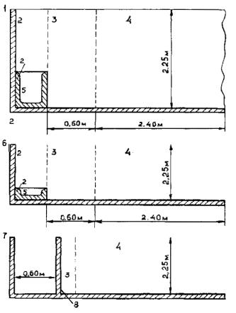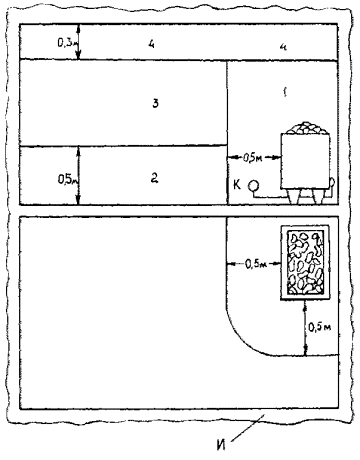 Рис. 10.9.А. Размеры зон (план) 1-а - ванна; 2-b - ванна со стационарной перегородкой; 3 - зона 0; 4 - зона 1; 5 - зона 2; 6 - зона 3; 7-с - душ с поддоном; 8-е - душ без поддона; 9-f - душ без поддона, но со стационарной перегородкой; 10 - разбрызгиватель душа; 11-d - душевой поддон со стационарной перегородкой Рис. 10.9. В. Размеры зон (вертикальный разрез) 1 - ванна; 2 - зона 1; 3 - зона 2; 4 - зона 3; 5 - зона 0; 6-h) душ с тазом; 7 - i) душ без таза, но со стационарной перегородкой; 8 - капитальная стена - перегородка. Рис. 10.9.С. Расположение душевой кабины (ДК), изготовленной заводским способом 10.12.8. Прочее стационарное оборудование Настоящие требования распространяются на установки, питающиеся от системы БСНН. В зоне 0 допускается применять только приборы, специально предназначенные для использования в ванне. В зоне 1 допускается устанавливать только электрические водонагреватели. В зоне 2 допускается устанавливать только водонагреватели и светильники класса II. 10.12.9. Нагревательные элементы, замоноличенные в полу и предназначенные для обогрева помещения, допускается устанавливать во всех зонах при условии, что они закрыты металлической сеткой или металлическим кожухом, присоединенным к системе уравнивания потенциалов. 10.13. Помещения, содержащие нагреватели для саунНастоящий раздел содержит специальные требования к электроустановкам помещений, содержащих нагреватели для саун, с целью обеспечения защиты людей от поражения электрическим током. Электроустановки помещений, содержащие нагреватели для саун, должны соответствовать общим требованиям раздела главы 5, с учетом требований настоящего раздела, которые дополняют общие требования. Требования по обеспечению безопасности10.13.1. Защита от поражения электрическим током с учетом следующих требований. При применении в качестве защитной меры системы БСНН защиту от прямого прикосновения независимо от номинального напряжения, следует выполнять: - при помощи установки ограждений* или оболочек, имеющих степень защиты не менее IP2X; - при помощи изоляции токоведущих частей, выдерживающей испытательное напряжение 500 В переменного тока (действующее значение) в течение 1 мин. * В ГОСТ 50571.12-96 ошибочно указаны барьеры. 10.13.2. Применение мер защиты от поражения электрическим током выполняется с учетом следующих требований. Меры защиты от прямого прикосновения, выполняемые путем установки барьеров или путем размещения токоведущих частей вне зоны досягаемости, не допускаются. Меры защиты при косвенном прикосновении посредством использования непроводящих помещений и посредством устройства систем местного уравнивания потенциалов, не соединенных с землей, не допускаются. Выбор и монтаж электрооборудования10.13.3. Электрооборудование должно иметь степень защиты не ниже IP24. 10.13.4. Регламентируются зоны размещения электрооборудования и требования к электрооборудованию (рис. 10.10): - зона 1, в которой допускается размещать только электронагреватели для саун; - зона 2, для которой требования по теплостойкости к электрооборудованию не устанавливаются; - зона 3, в которой электрооборудование должно выдерживать температуру не менее 125 °С, а изоляция проводов и кабелей - не менее 170 °С; - зона 4, в которой должны устанавливаться только устройства управления электронагревателями (термостаты и ограничители температуры) и электропроводка к ним. Элек