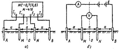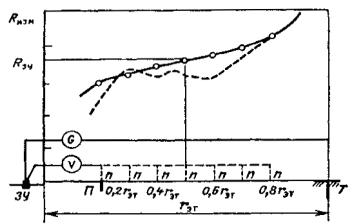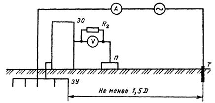 где Uизм - измеренное значение напряжения прикосновения при токе в измерительной цепи; Iк.расч - расчетный для заземляющего устройства ток короткого замыкания; Rст.изм.ср - среднее значение сопротивлений потенциального электрода, измеренных по схеме рис. 11.4 в момент измерения напряжений прикосновения; Rcm.min - минимальное значение сопротивления потенциального электрода. Сопротивление потенциального электрода Rст.изм измеряется с помощью мегаомметра со шкалой от 100 Ом в четырех - шести точках измерения напряжения прикосновения при существующей при этих измерениях влажности грунта (при сухом грунте во время измерения Uпр производится увлажнение грунта под потенциальным электродом на глубину 2 - 3 см). Для пересчета используется среднее из измеренных значений Rст.изм. Минимальное значение сопротивления потенциального электрода Rcm.min измеряется по схеме рис. 11.4 в одной из точек после измерения Uпр и Rст.изм при искусственно увлажненном на глубину 20 - 30 см грунте. При отсутствии возможности увлажнения грунта на глубину 20 - 30 см ρ принимается по следующим значениям: Грунт в месте измерений Удельное сопротивление, Ом Бетон, травяной покров на глинистом грунте, супесь без травы................................................... 250 Песок, песчано-гравийная смесь, очень мелкий загрязненный почвой щебень, травяной покров на песке...................................................................................... 1200 Щебень, загрязненный почвой, метлахская плитка....................................................................... 10000 Если при измерениях Rст.изм получилось меньше указанных значений, то Rcm.min принимается равным Rст.изм. Если во время