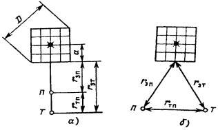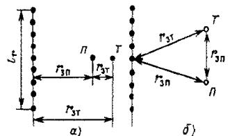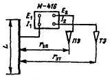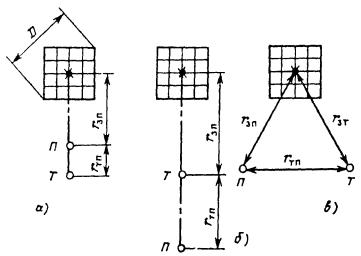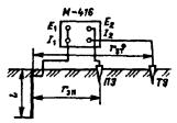 Рис. 11.4. Пример построения зависимости измеренного сопротивления заземляющего устройства от положения потенциального электрода Если значения сопротивлений, измеренные при положениях потенциального электрода на расстояниях 0,4rзт и 0,6rзт, отличаются более чем на 10 %, то измерения сопротивлений необходимо повторить при увеличенном в 1,5 - 2 раза расстоянии до токового электрода. Если полученная измерением зависимость сопротивления отличается от зависимости, изображенной сплошной линией (например, как изображенная штриховой линией), что может быть следствием влияния подземных или наземных коммуникаций, то измерения должны быть повторены при расположении токового электрода в другом направлении от заземляющего устройства. Измерительные электроды должны быть приняты в соответствии с инструкцией к применяемому прибору. Измерительные приборы (амперметр, вольтметр, измеритель заземления) и трансформатор тока должны иметь класс точности не менее 2,5. При применении измерителей сопротивления (например, типа МС-08) или геофизического прибора ИКС их токовые и потенциальные зажимы следует присоединять к испытуемому заземлителю отдельными проводниками. В целях исключения возможного влияния посторонних токов на результаты измерения необходимо проверить наличие напряжения между заземлителем и потенциальным электродом при отключенном источнике измерительного тока. При наличии напряжения от посторонних токов необходимо принять меры к возможному уменьшению его значения (например, отключить электросварку) или уменьшению его влияния. Для этой цели рекомендуется повысить измерительное напряжение (если это возможно по условиям техники электробезопасности) или использовать отстройку по частоте (применить прибор типа ИКС или МС-08). В отдельных случаях может помочь также изменение направления разноса измерительных электродов. Схема разбирается лишь после выполнения всех измерений и подсчетов, подтверждающих удовлетворительный результат измерений. Наибольшее сопротивление заземлитель имеет летом при наибольшем высыхании земли или зимой при наибольшем ее промерзании. Если сопротивление заземлителя измерялось в сезон, отличный от предполагаемого сезона наибольших его значений, то измеренную величину R3 умножают на сезонный коэффициент сопротивления заземлителя Кс. При измерении R сложных заземлителей в виде замкнутого контура целесообразно отмерять расстояния от края контура, как показано на рис. 11.5, 11.6, при этом расстояние от геометрического центра сложного заземлителя до края контура а следует определять, используя проектные данные. Рис. 11.5. Основные схемы взаимного расположения заземлителя З и электродов Т и П: а, б - однолучевые схемы; в - двухлучевая схема; ´ - центр заземлителя Если заземлитель выполнен в виде одиночной горизонтальной полосы с рядом вертикальных электродов (гребенка) или без них (простой горизонтальный), то результаты измерения R оказываются достаточно точными при расположении Т и П в соответствии с рис. 11.7. Рис. 11.6. Определение расстояний до электродов Т и П от края контура сложного заземлителя: а - однолучевая схема; б - двухлучевая схема; ´ - центр заземлителя Рис. 11.7. Схемы расположения электродов Т и П при измерении сопротивления сложного заземлителя в виде гребенки: а - однолучевая; б - двухлучевая В. 