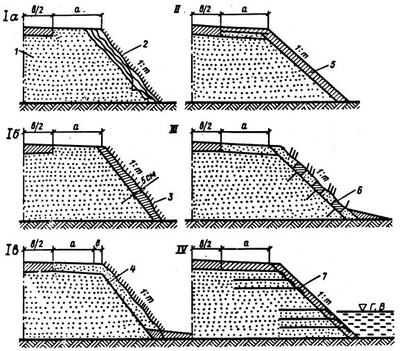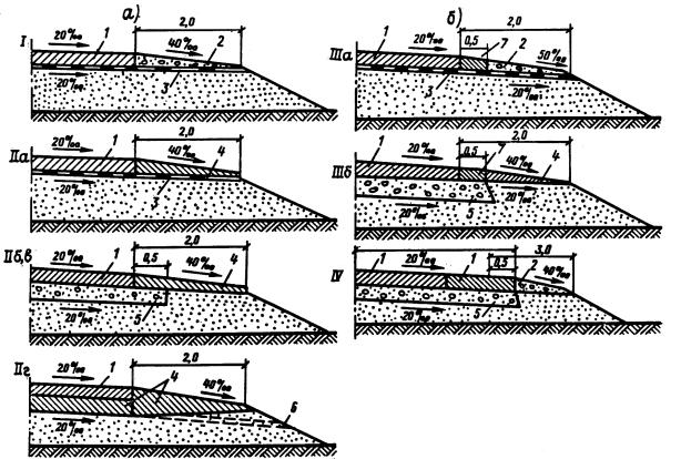 Рис.3. Конструкции укрепления откосов: I а - гидропосевом, трав по грунту откоса; I б - то же, по торфопесчаной смеси; I в - то же, по дорниту; II - грунтом, обработанным вяжущими; III - решетчатыми сборными конструкциями; IV - грунтом, обработанным вяжущими и армированием откоса дорнитом; 1 - грунт откоса; 2 - гидропосев трав по растительному грунту; 3 - гидропосев трав по торфопесчаной смеси; 4 - гидропосев по дорниту; 5 - укрепленные грунты; 6 - сборные решетчатые конструкции; 7 - дорнит. Технология производства работ по укреплению откосов4.13. Основные технологические процессы устройства конструкций укрепления биологических типов должны включать: заготовку растительного грунта, приготовление торфогрунтовых смесей, приготовление рабочей смеси из семян трав и удобрений, их доставку к месту работ и распределение на поверхности откосов. 4.14. Рабочие смеси из торфогрунта готовят путем перемешивания с помощью автогрейдера предварительно привезенного самосвалами на обочину дороги торфа и грунта (перемешивание осуществляется продольными проходами автогрейдера по обочине с последующим перемещением смеси на поверхность обочины и откоса). Рабочую смесь из семян и удобрений для гидропосева приготавливают на специально подготовленной базе, которая должна иметь складские помещения для хранения семян и удобрений, емкости для пленкообразующих материалов, вибросита с ячейками 10x10 мм для просеивания опилок, установку для измельчения соломы, весы для развески семян и удобрений, грузоподъемные средства. Рабочие смеси из грунтов, обработанных вяжущими материалами (нефть, цемент или комплексное вяжущее на их основе), могут быть приготовлены непосредственно в грунтовом карьере в стационарной или передвижной смесительных установках; на обочине автомобильной дороги (в процессе укрепления самой обочины) путем перемешивания грунта и вяжущего автогрейдером. 4.15. Устройство прослоек из СНМ в самих откосных частях земляного полотна или на их поверхности включает: доставку и разгрузку рулонов СНМ к месту строительства, подготовку рулонов СНМ к укладке; распределение СНМ по глубине откосов или на их поверхности. При этом следует иметь в виду, что армирование откосов по глубине должно выполняться в процессе послойной отсыпки земляного полотна. Для этого после отсыпки,. грунтового слоя требуемой толщины, разравнивания его, профилировки в пределах откоса и последующего тщательного уплотнения укладывают прослойку из СНМ таким образом, чтобы по ширине материал был распределен с выпуском на поверхность откоса на 0,5-0,75 м. Выпускаемые концы прикрепляют к грунту откоса скобами из проволоки диаметром 4-6 мм. 4.16. Для гидропосева семян многолетних трав используют гидросеялки на базе поливочно-моечной машины ПМ-130 или типа ДЭ-16. Посев гидросеялками производят последовательными проходами машин по обочине земляного полотна, добиваясь равномерного распределения смеси на поверхности откоса. Скорость движения автомобиля по обочине подбирают опытным путем в зависимости от длины откоса. Следует принимать меры по предотвращению стекания смеси с откоса. Места заправки гидросеялок располагают на середине укрепляемого участка с дальностью действия машин не более 10 км. Следует добиваться повышения производительности гидросеялки до 5000 м2 укрепляемой поверхности за смену. 